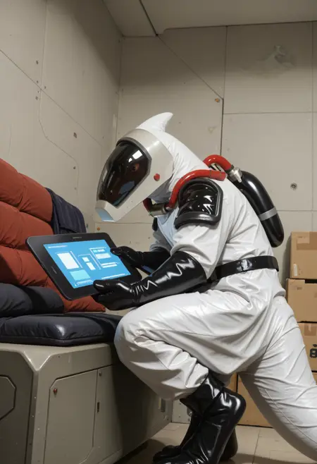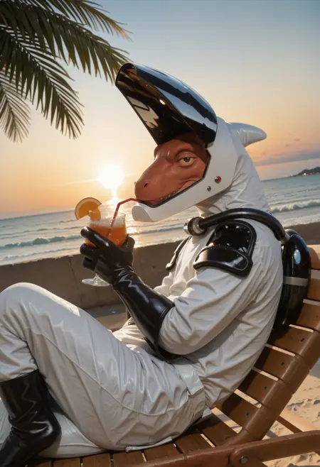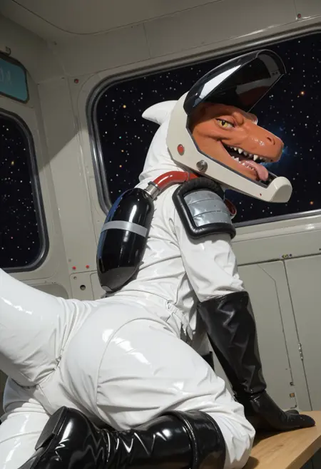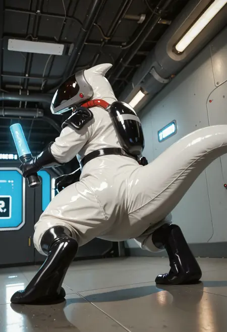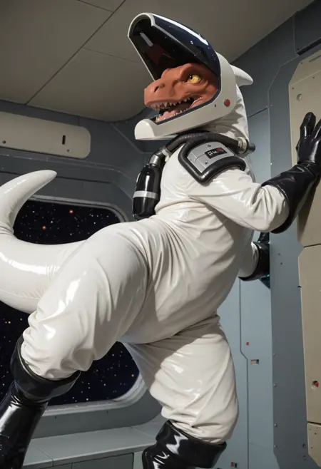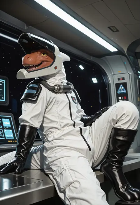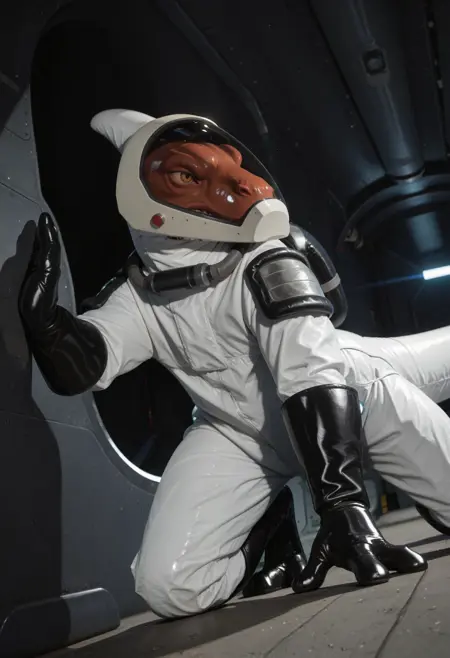 ugf_tro0pers, dinosaur, alien, white jumpsuit, shoulder armor, tight-fitting spacesuit, gloves, solo, tail, no humans, male focus, helmet, furry, 1boy