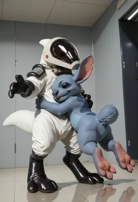 📝 UGF Trooper — солдат Объединённой Галактической Федерации из вселенной Lilo & Stitch. Это антропоморфный рептилоид вида Raptorsellus, служащий в охране и спецподразделениях. Обычно одет в белый герметичный скафандр с чёрными перчатками и ботинками, шлемом с визором и рюкзачным блоком с кабелями. Вооружён компактным жёлтым бластером с красной рукоятью. Основные задачи — патрулирование, охрана объектов, сопровождение заключённых и поддержание порядка в зонах ответственности Федерации.