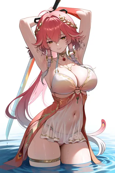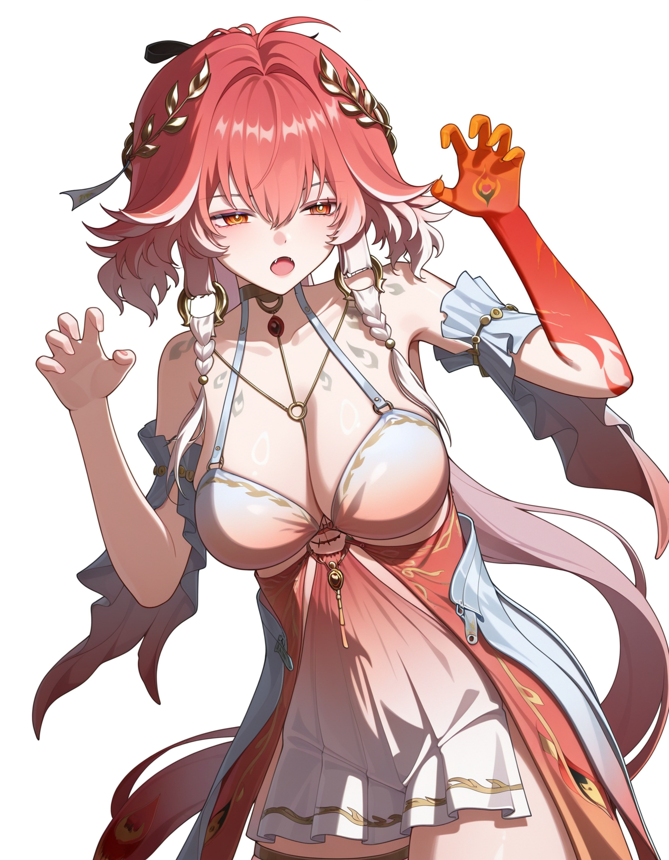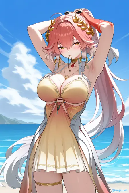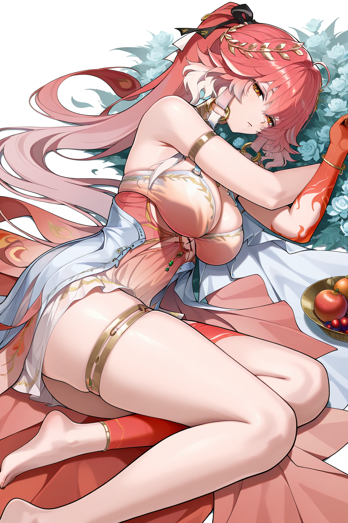 changli \(laurel nymph\) \(wuthering waves\), 1girl, breasts, solo, yellow eyes, dress, pink hair, cleavage, hiar ornament, long hair, red gloves, jewelry, swinsuit, bikini, ahoge, very long hair, thighlet, laurel crown, thigh strap, necklace, hair between eyes, collarbone