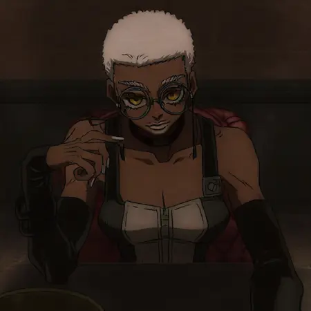 Semiu Grier, Gachiakuta, brown skin, short white hair, round glasses, medium breasts, black arm sleeves, yellow eyes, white nails, white eyebrows, white eyelashes