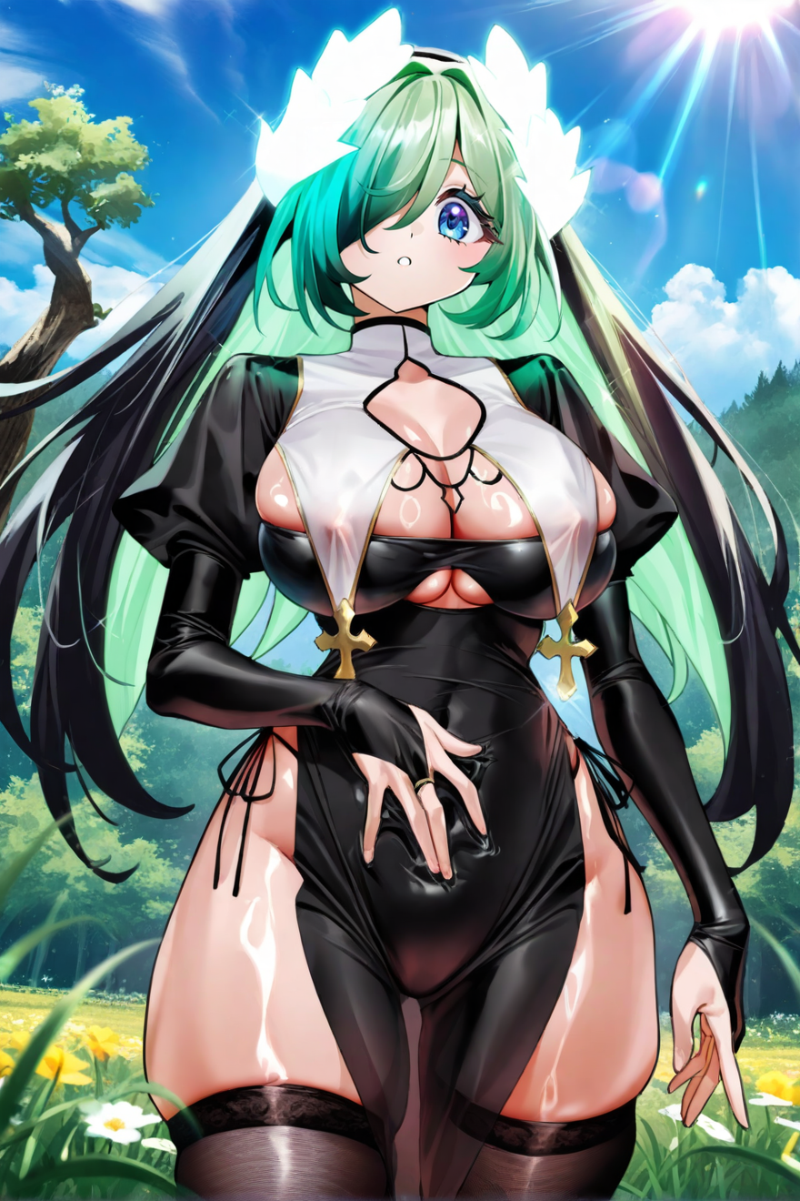 huge breasts,nun,pelvic curtain,bridal gauntlets,licking finger,side-tie panties