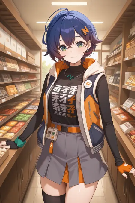 aabelle, 녹색 눈, 파란 머리, 다색 머리, ahoge, belledef, 헤어클립, 귀걸이, 목걸이, 검은 셔츠, 옷에 문구, 긴 소매, 다색 재킷, 소매 없는 재킷, 후드 내려짐, 주황색 장갑, 한쪽 장갑, 손가락 없는 장갑, 주황색 벨트, 회색 치마, 허리 높은 치마, 계층적 치마, 한쪽 허벅지 화이트, 검은 허벅지 화이트,