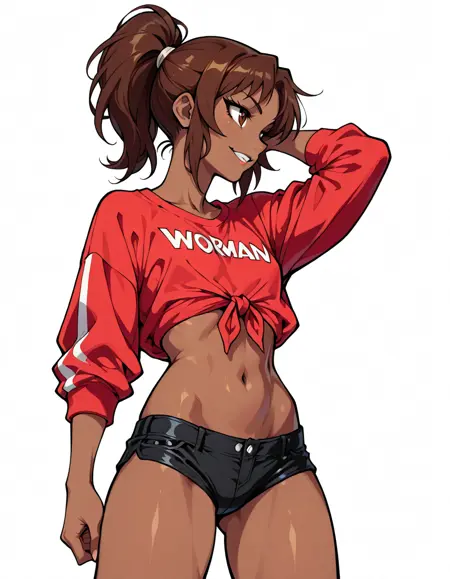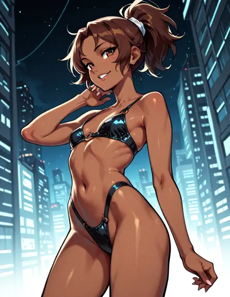 black woman, dark skin, tomboy female characteristics, adventurous troublemaker, petite Kickboxer & Delivery Girl, Athletic and toned petite body, medium length full-bodied wavy brown hair, tied-back bushy ponytail hairstyle