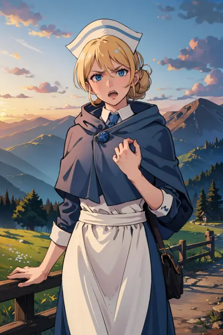 Add "hat, blue capelet, blue dress, apron" for her typical look.