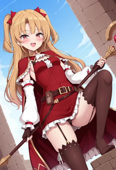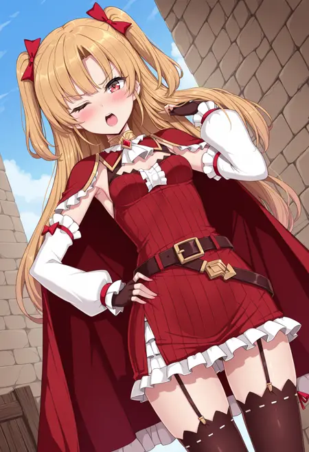빨간 드레스, 프릴, 주름진 드레스, 어깨없는 드레스, 흰색 애스콧, 분리형 소매, 흰색 소매, 손가락 없는 장갑, 벨트, 가스터 스트랩, 허벅지 길이 양말, 빨간 망토, 빨간 카펠릿,
