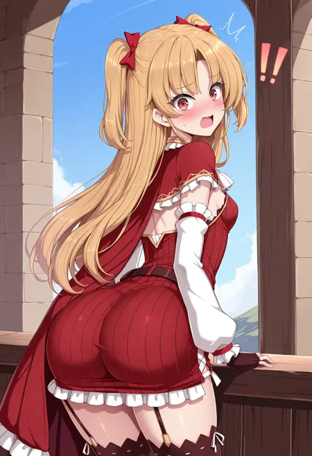 shnolaur, 금발, 긴 머리, 양쪽 위로 묶음, 붉은 눈, 헤어 리본, 작은 가슴,
