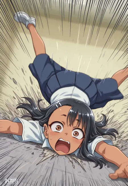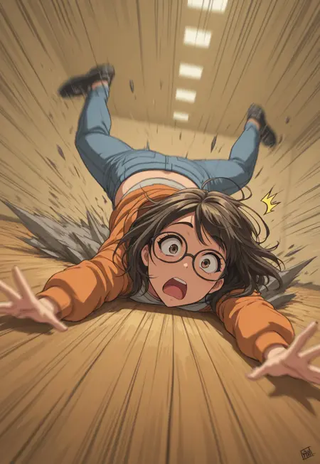 喜剧性摔倒、滑倒、脸着地、动态姿势、动作线、运动模糊、惊讶表情