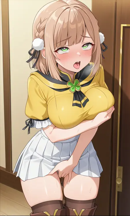 ChloePawapua, light brown hair, bob cut, green eyes, symbol-shaped pupils, clover-shaped pupils, bangs, side hair braid, pom-pom accessory, sailor-style collar, yellow jacket, frilly sleeve edges, white skirt, pleated high-waisted skirt, thigh-high socks, black stockings, brown heeled boots, gold accents, magic staff, fantasy shoulder satchel with large gem ornament, leather bag, ornate magic staff with clover motif, gold and green accents anime eyes
