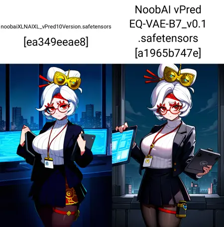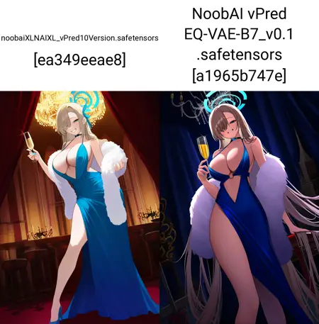 A finetune, aligning NoobAI v-pred 1.0 to Anzhc's EQ-VAE-B7 for basic usage and further training with loras or finetuning, less noisy generations due to cleaner latents at training time, usual v-pred shenanigans apply, but model should be more resilient to colors exploding and colors should be a bit cleaner overall compared to base v-pred, does this behave like a slight aesthetic tunning? yes due to limited data get me a 5090 and I can do bigger finetunes instead of choking my 4090,, this was trained for 370k steps on 1x4090 I slammed my head hard against the dataset and compute wall, go donate to Anzhc for his efforts training the VAE.