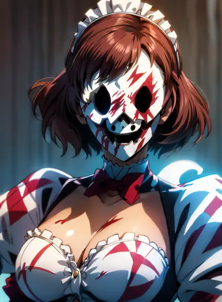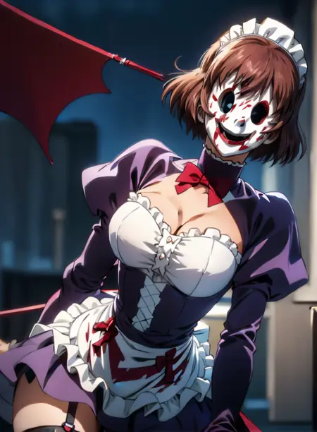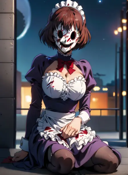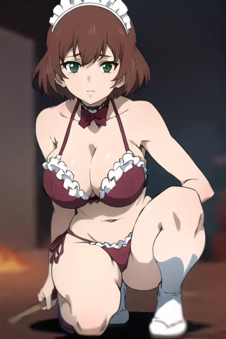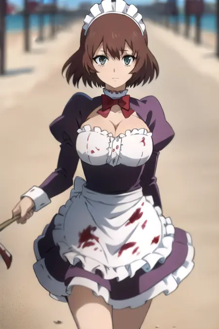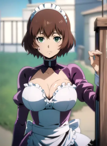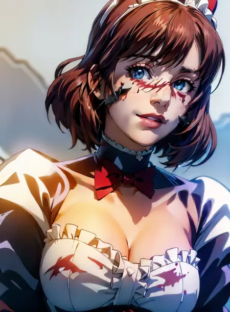 外观:杰作,最佳质量,1个女孩,女仆头饰,棕色头发,大乳房,短发,衣服上有血迹,单人,绿色眼睛