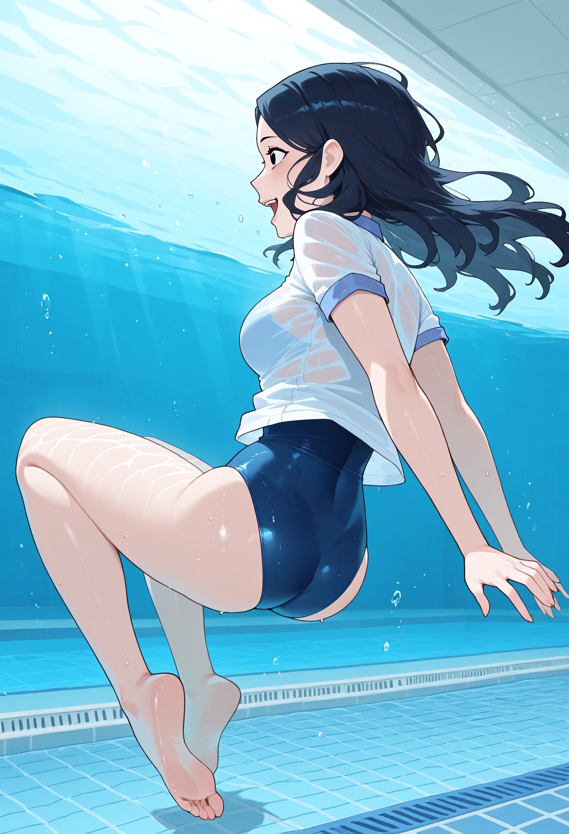 white shirt, collared shirt, polo shirt, short sleeves, swimsuit, blue one-piece swimsuit, swimsuit under clothes, barefoot