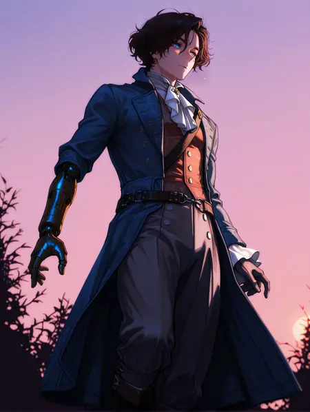 피노키오 프롬프트: 1boy, male, manly, blue eyes, black hair, short hair, freckles, prosthesis, single mechanical arm