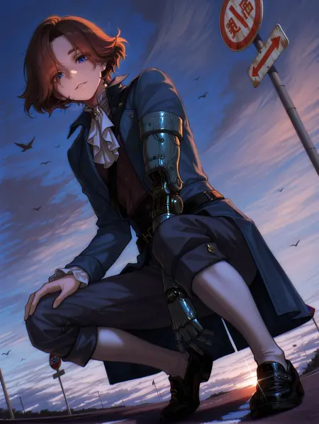 복장 프롬프트: ascot, coat, belt, white ascot, long sleeves, red shirt, pants, blue coat, white pantyhose, black footwear