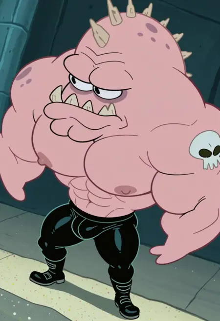 강화 프롬프트: "anthro, black eyes, spikes, skull tattoo, chibi, muscular, masculine, bara"