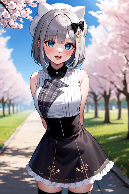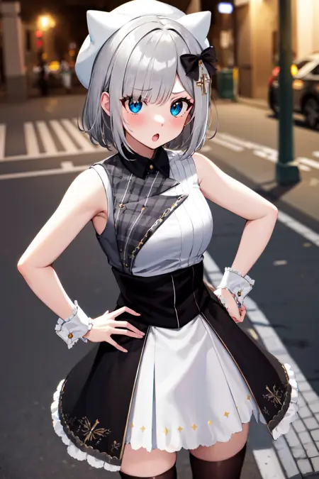 아웃피트2 (카프레트 미포함)1girl, aasumire, 단발, 회색 머리, 머리리본, 검정 리본, 머리 장식, 모자, 흰색 머리장식, 가짜 동물 귀, 팔 없는, 흰색 셔츠, 손목 커프스, 하이웨이스트 스커트, 검정 허벅지 스타킹