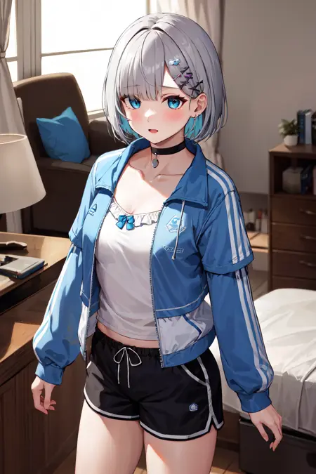 아웃피트31girl, bbsumire, 단발, 회색 머리, 다색 머리, 헤어클립, 귀걸이, 초크, 어깨뼈, 흰색 캐미솔, 파란 재킷, 열린 옷, 긴 소매, 검정 반바지, 짧은 반바지
