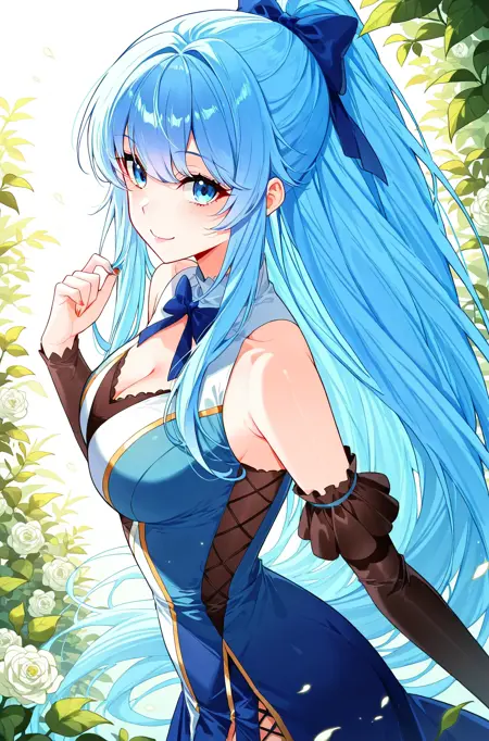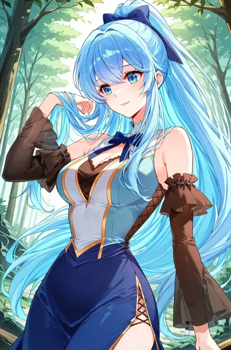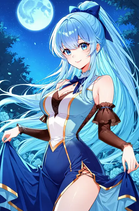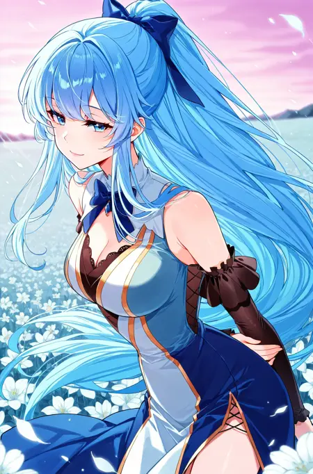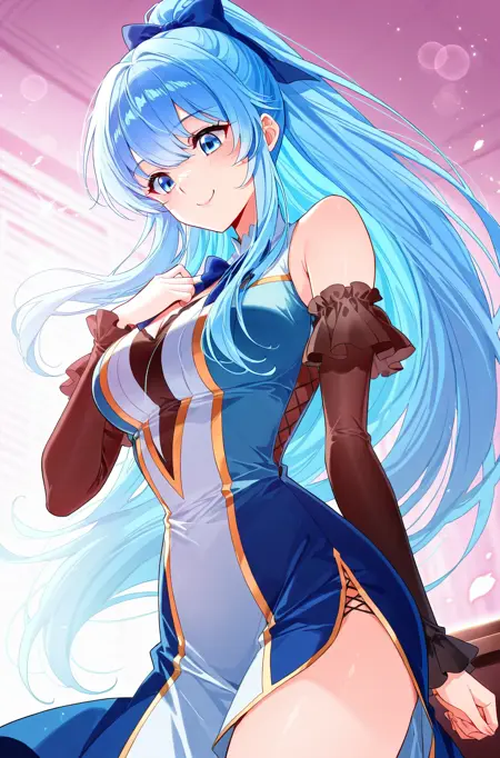| トレーニングワード | Ruoruo, 1girl, solo, long hair, very long hair, gradient hair, blue hair, light blue hair, uneven bangs, parted bangs, long sidelocks, hair bow, dark blue hair bow, high ponytail, blue eyes,コピーしました! Ruoruo_outfit, sleeveless dress, blue halter dress, white collar, white front panel, gold trim ribbon bow, blue ribbon bow, cleavage cutout, black bodice underlayer, waist hip cutout, side torso slit, side lacing over black bodice, thigh slit, black sheer detached sleeves, frilled detached sleeves, blue skirt, side lace-upコピーしました! |