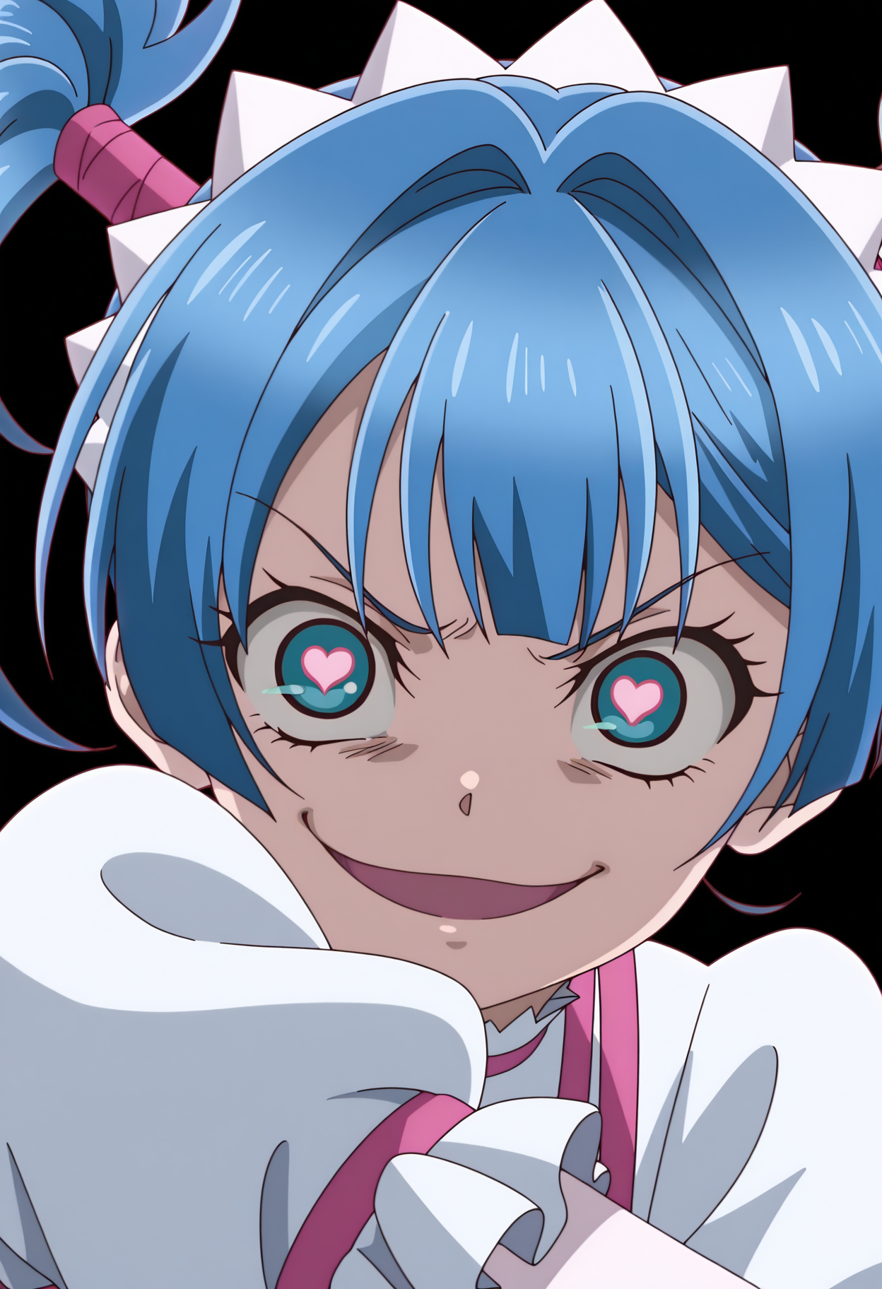 1girl, solo, renka, blue hair, twintails, short hair, green eyes, bangs, symbol-shaped pupils, heart-shaped pupils, short twintails