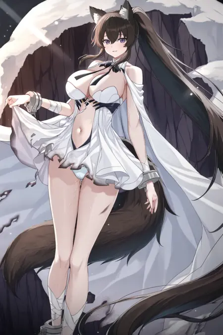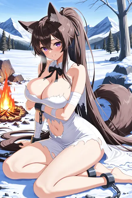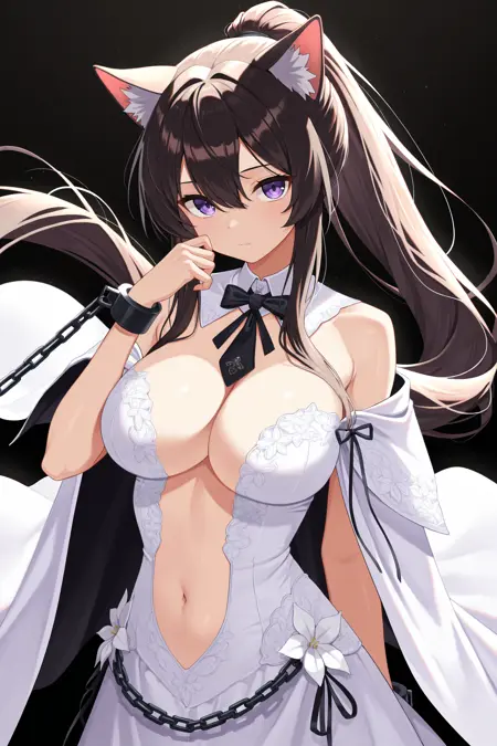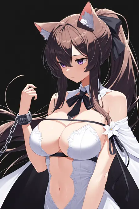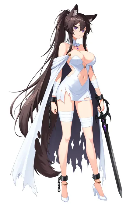 | Trained Words | YooMinaWolf, 1girl, solo, long hair, large breasts, black hair, brown hair, purple eyes, ponytail, dress, navel, animal ears, ribbon, hair between eyes, cleavage, bare shoulders, very long hair, absurdly long hair, tail, full body, thighs, white dress, high heels, animal ear fluff, strapless, torn clothes, black bow, neck ribbon, black ribbon, detached collar, chain, bandages, white footwear, wolf ears, wolf tail, cuffs, black bowtie, bandaged arm, wolf girl, bandaged leg, white collar, handcuffs, shackles, broken, torn dress, broken chain, burnt clothes,Copied! |