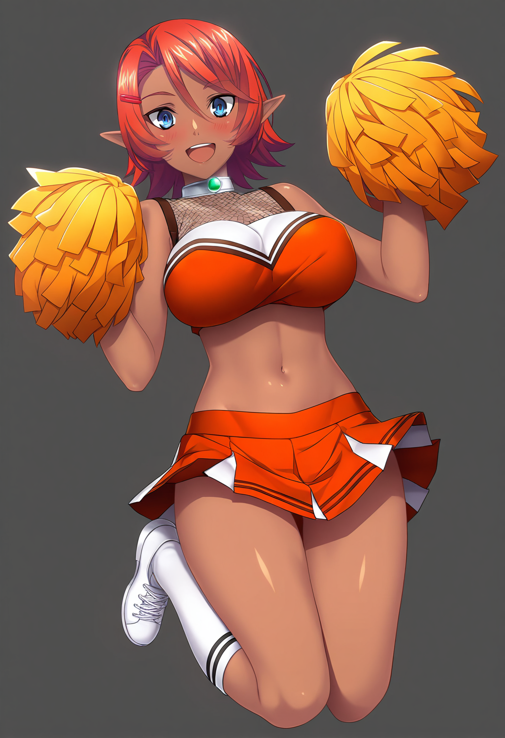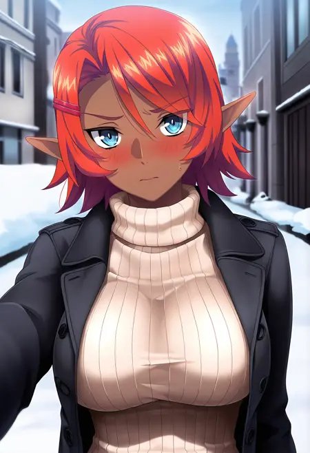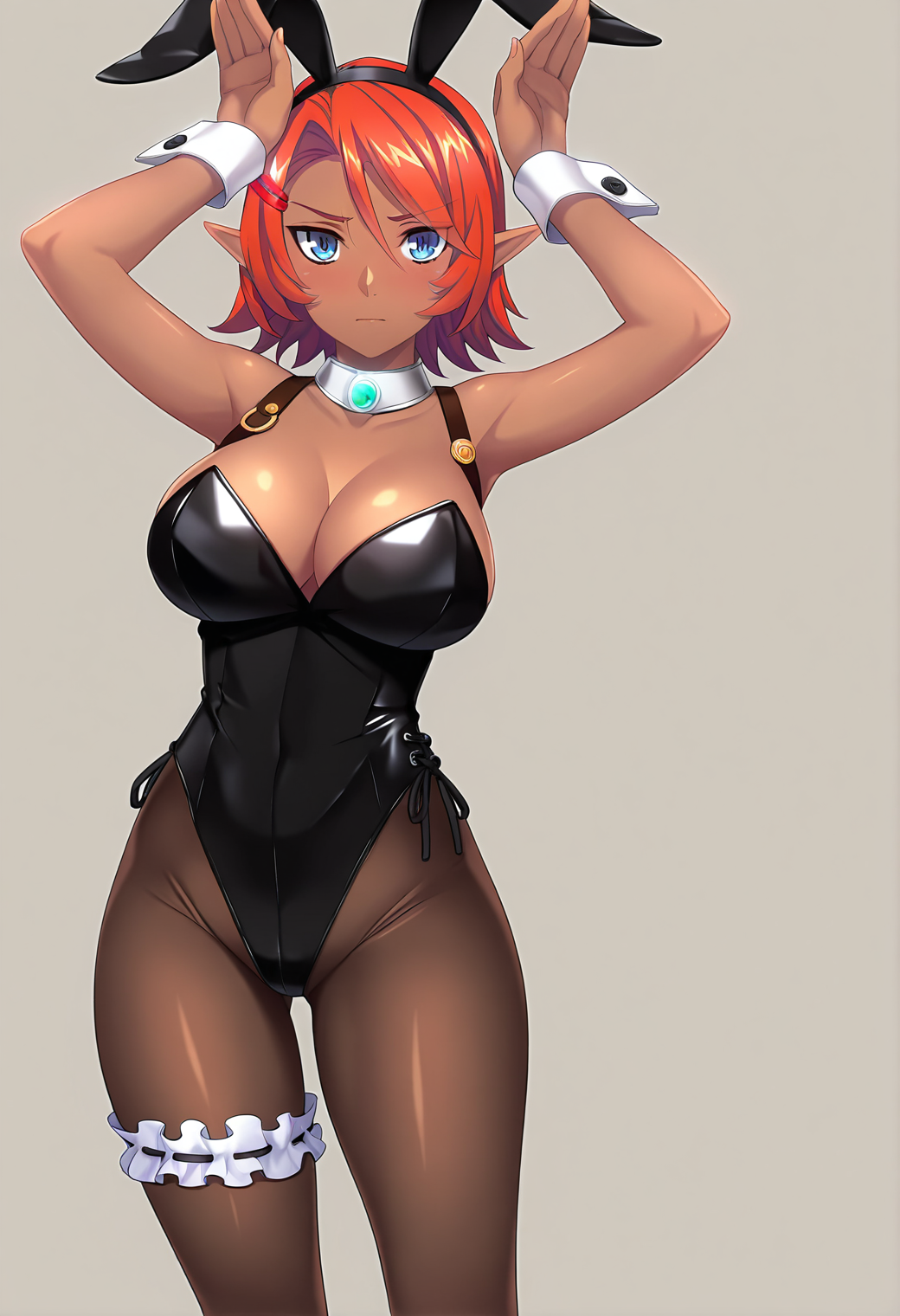 saraelfenk,red hair,blue eyes,dark-skinned female,dark elf,short hair