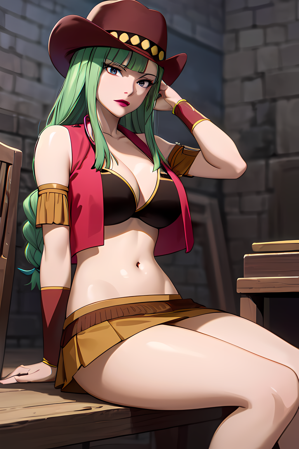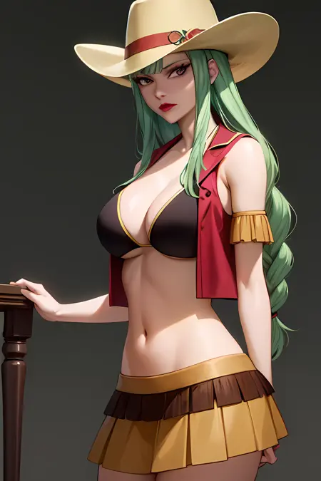 miniskirt, bikini top only, vest, cowboy hat - tags for main outfit