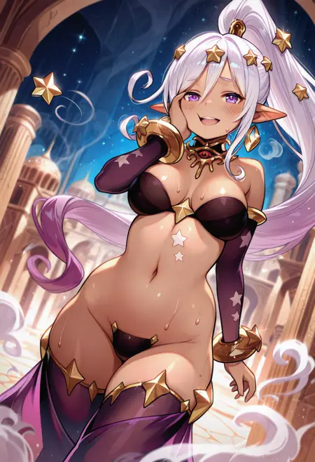 genie, dark skin, dark-skinned female, pointy ears, floating, ghost tail, feet