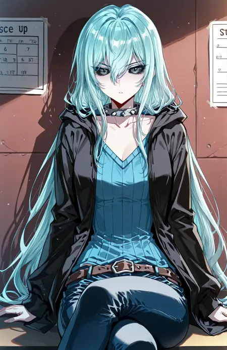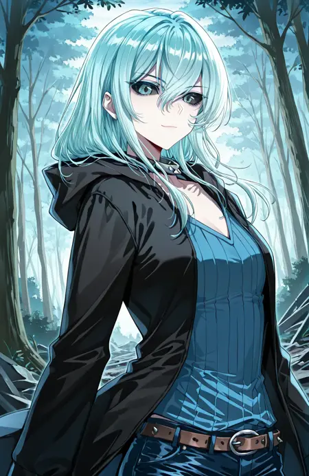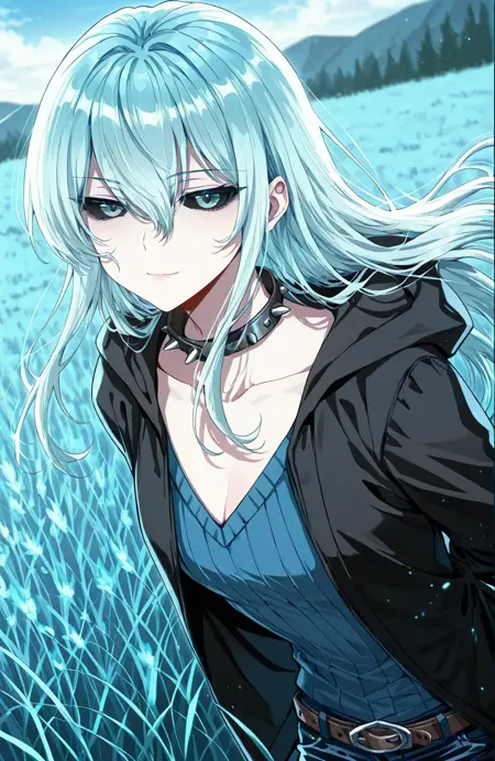 Wuyu_outfit, hood, black hooded coat, blue sweater, v-neck sweater, vertical ribbed knit, blue pants, jeans, brown belt, spiked collar, spiked choker, black choker,