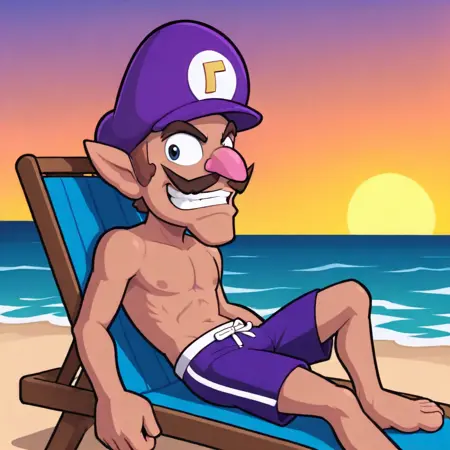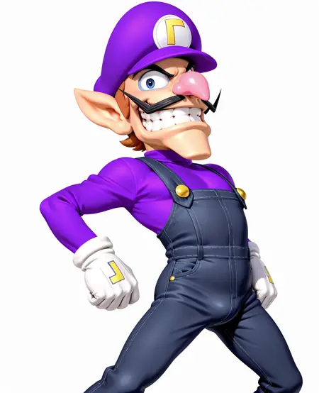 ポジティブプロンプト: 紫のシャツ、ひげ、ピンクの鼻、大きな鼻、紫のキャップ、とがった耳、1人の少年、歯、にやりとした笑み、手袋、オーバーオール