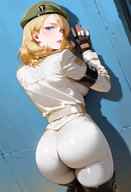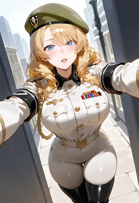 衣装: sonyaaltmkda, 1girl, 金髪, グローブ, ハット, ユニフォーム, 緑のベレー帽, ブーツ, 自衛隊制服, フィンガーレスグローブ, 太ももブーツ, アームバンド, グレーのジャンプスーツ, パンツ, 青い目