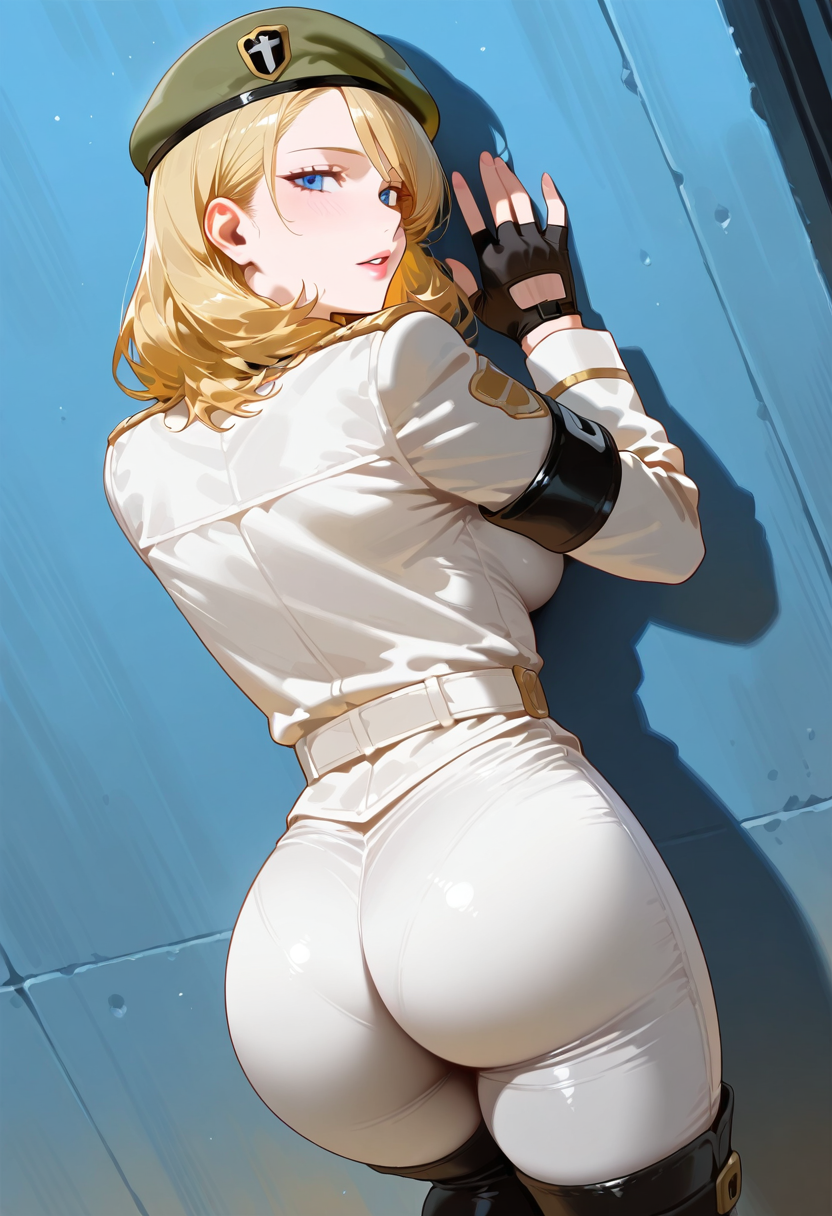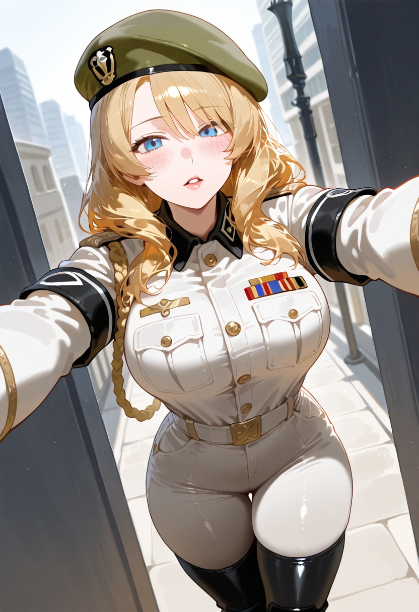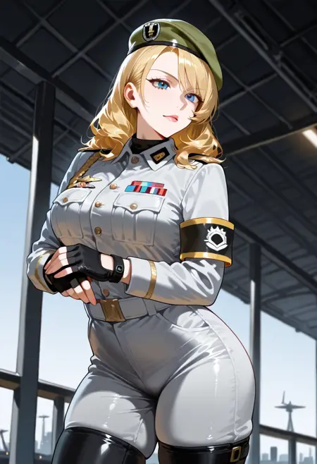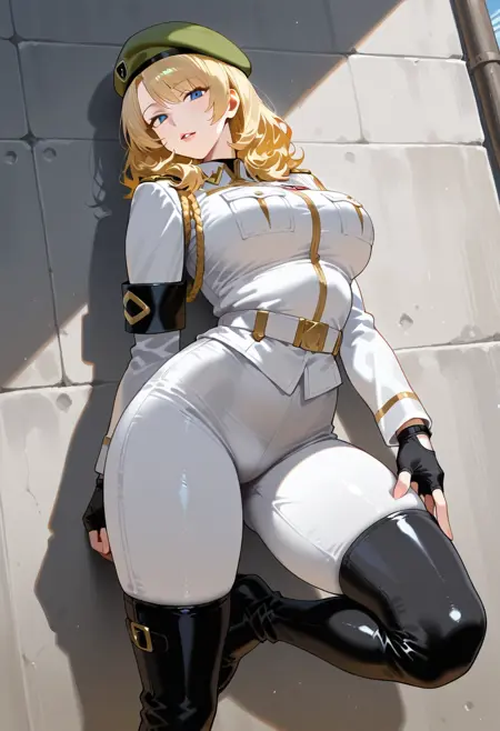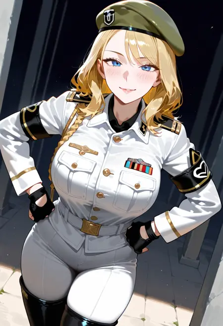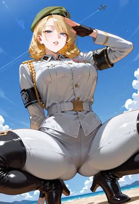 服装:sonyaaltmkda,1个女孩,金发,手套,帽子,制服,绿色贝雷帽,靴子,军装,露指手套,大腿靴,臂章,灰色连体服,裤子,蓝眼睛
