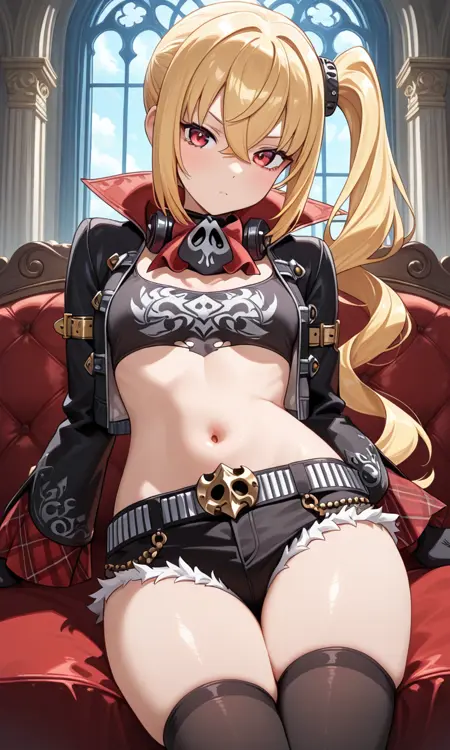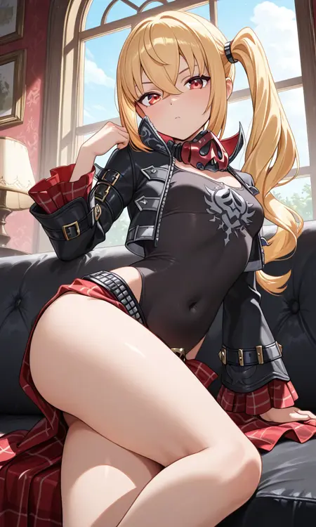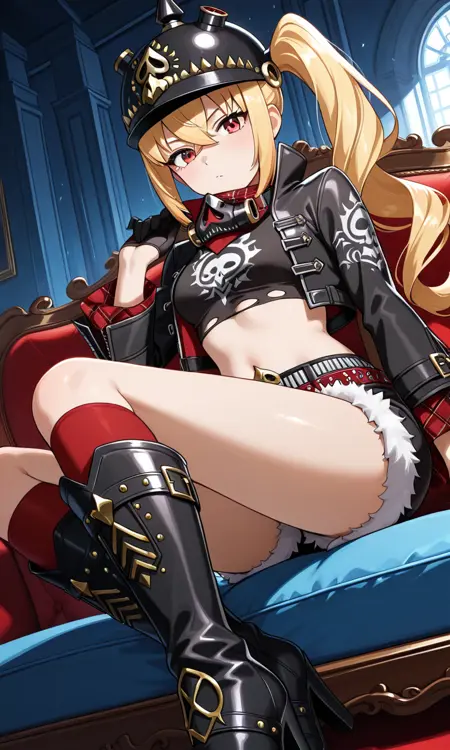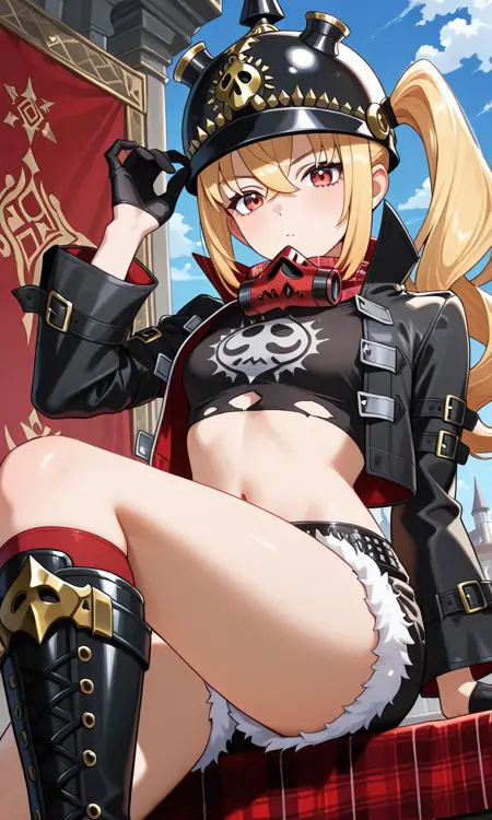 피켈하우베, 검은 재킷, 긴 소매, 벌어진 재킷, 목 주변 마스크, 반장갑, 검은 셔츠, 크롭 탑, 복부, 검은 반바지, 털 장식 반바지, 부츠, 하이힐 부츠, 무릎 부츠, 찢어진 셔츠, 빨간 스카프, 체크무늬 스카프, 빨간 옷, 체크무늬 옷, 빨간 무릎 양말,