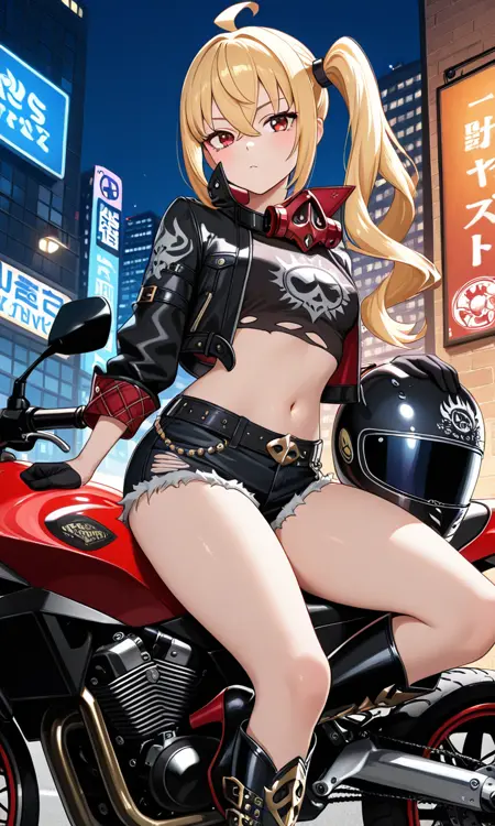 모터사이클 헬멧, 검은 재킷, 긴 소매, 벌어진 재킷, 목 주변 마스크, 반장갑, 검은 셔츠, 크롭 탑, 복부, 검은 반바지, 청바지, 하이힐 부츠, 무릎 부츠, 찢어진 셔츠