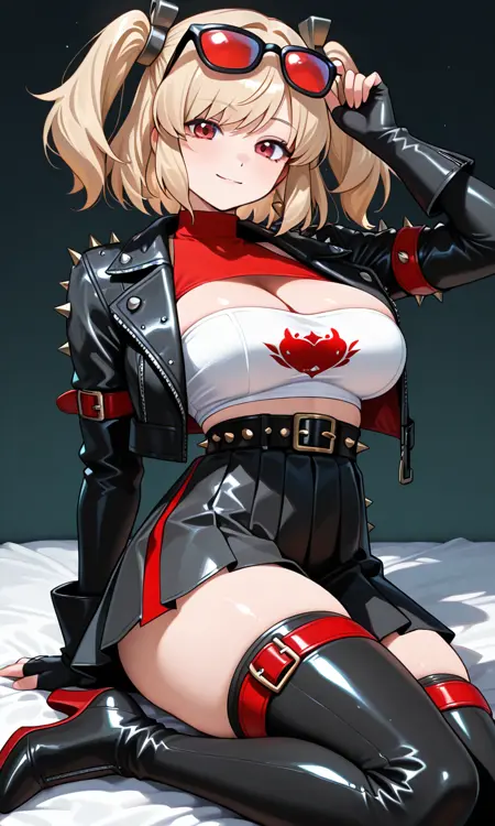 頭に眼鏡、サングラス、黒いジャケット、スパイク付きジャケット、レザージャケット、短めのジャケット、開いたジャケット、赤いタートルネック、ハーネック、ツートンチューブトップ、黒いチューブトップ、乳首の露出、黒いベルト、スパイク付きベルト、ハイウエストスカート、黒いミニスカート、プリーツスカート、赤い太ももベルト、黒いレッグブーツ、ハイヒールブーツ、肘まで手袋、指なし手袋、黒い手袋