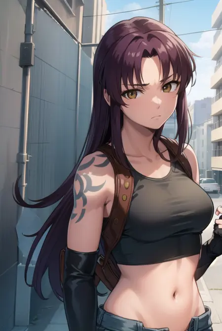 rebecca lee, revy \(black lagoon\), long hair, purple hair, (brown eyes:1.5), ponytail, (parted bangs:1.5),