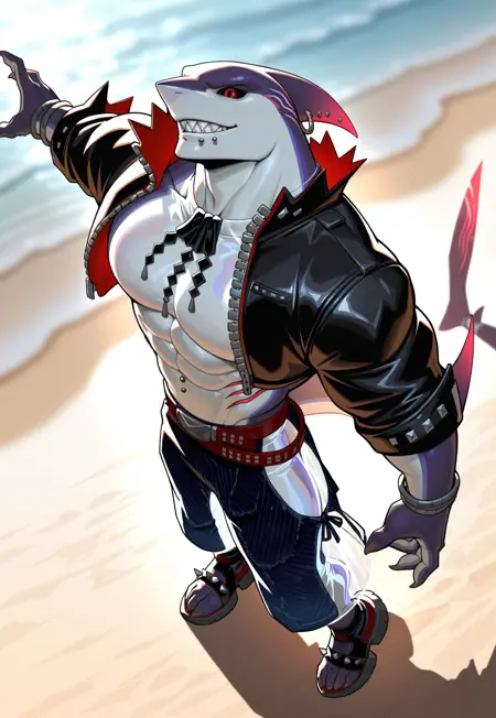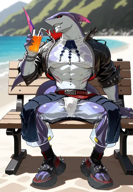 shark boy, furry, furry male, muscular male, purple skin, abs, navel, lip piercing, navel piercing, piercing, earring, pectorals, sharp teeth, claws, black sclera, red eyes, gills, shark tail,