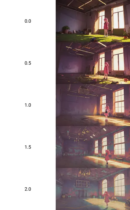 強度は 0 から 2.0 までさまざまな値で動作します。この LORA は過剰に学習されないように訓練されており、強度 1.0 では効果が比較的控えめになる可能性があります。