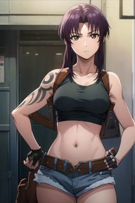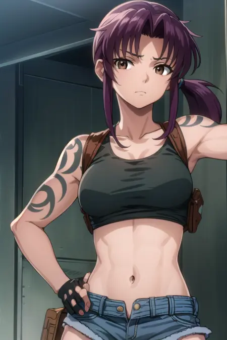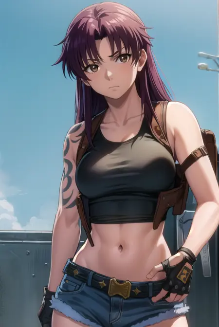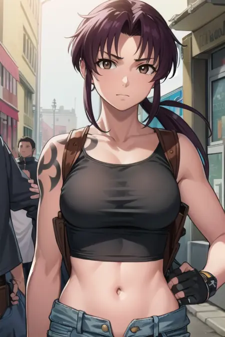 rebecca lee, revy \(black lagoon\), 长发, 紫色头发, (棕色眼睛:1.5), 马尾, (分叉刘海:1.5),