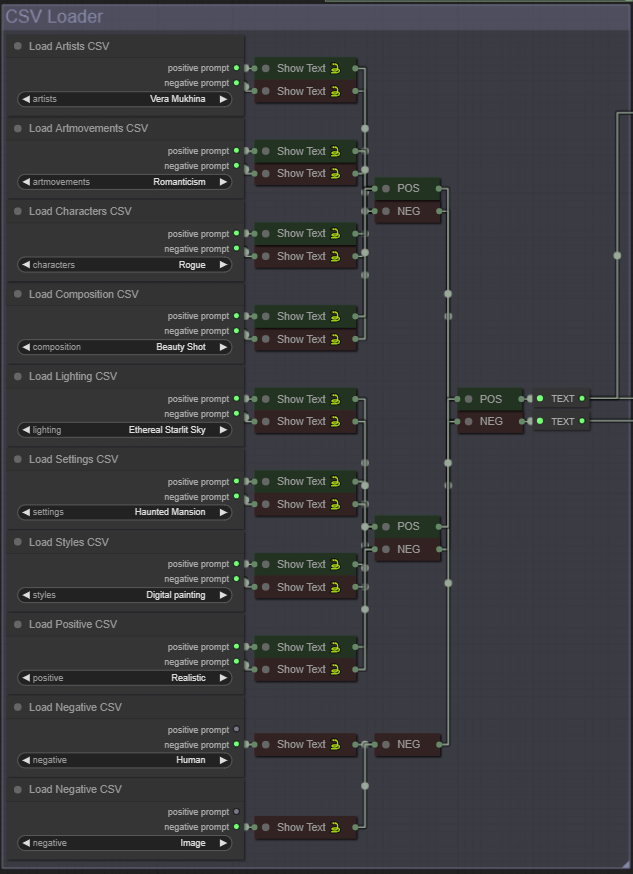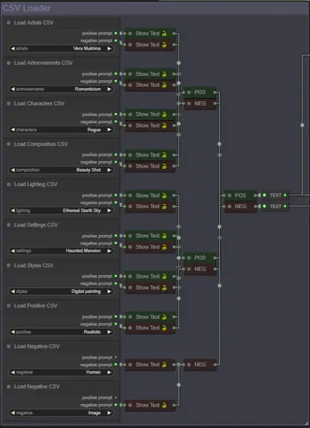 CSV文件所在的文件夹位于ComfyUI\custom_nodes\ComfyUI-CSV-Loader\CSV,以便所有内容集中管理。CSV文件包括artists.csv、artmovements.csv、characters.csv、colors.csv、composition.csv、lighting.csv、negative.csv、positive.csv、settings.csv和styles.csv。所有文件均包含一些预加载的选项,但您可以随时在CSV文件中进行更新。