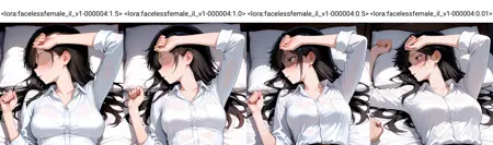 The keyword “faceless_female” usually works well as long as it does not include tags related to eyes. However, if the eye color is specified as fixed in batch processing, eyes may be drawn even if “faceless_female” is included in the prompt.