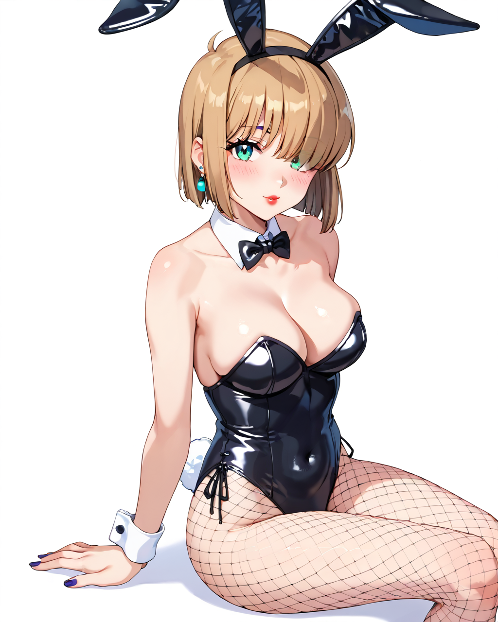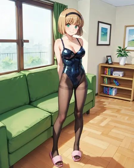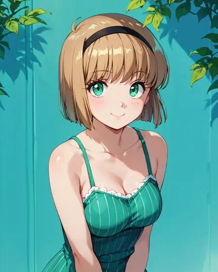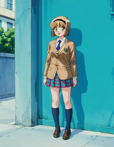• Miki Hosokawa, Miki, brown hair, green eyes, black hairband, hairband, bob cut, short hair, school uniform, blue necktie, full body, plaid, plaid skirt, kneehighs