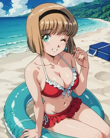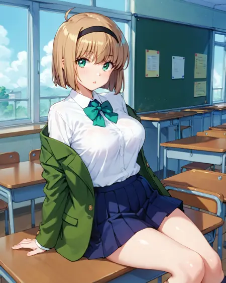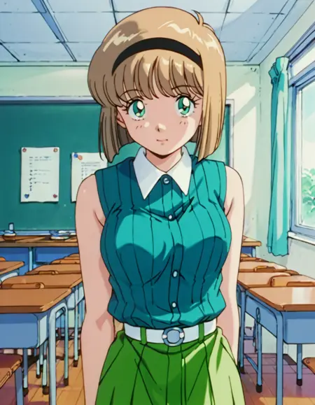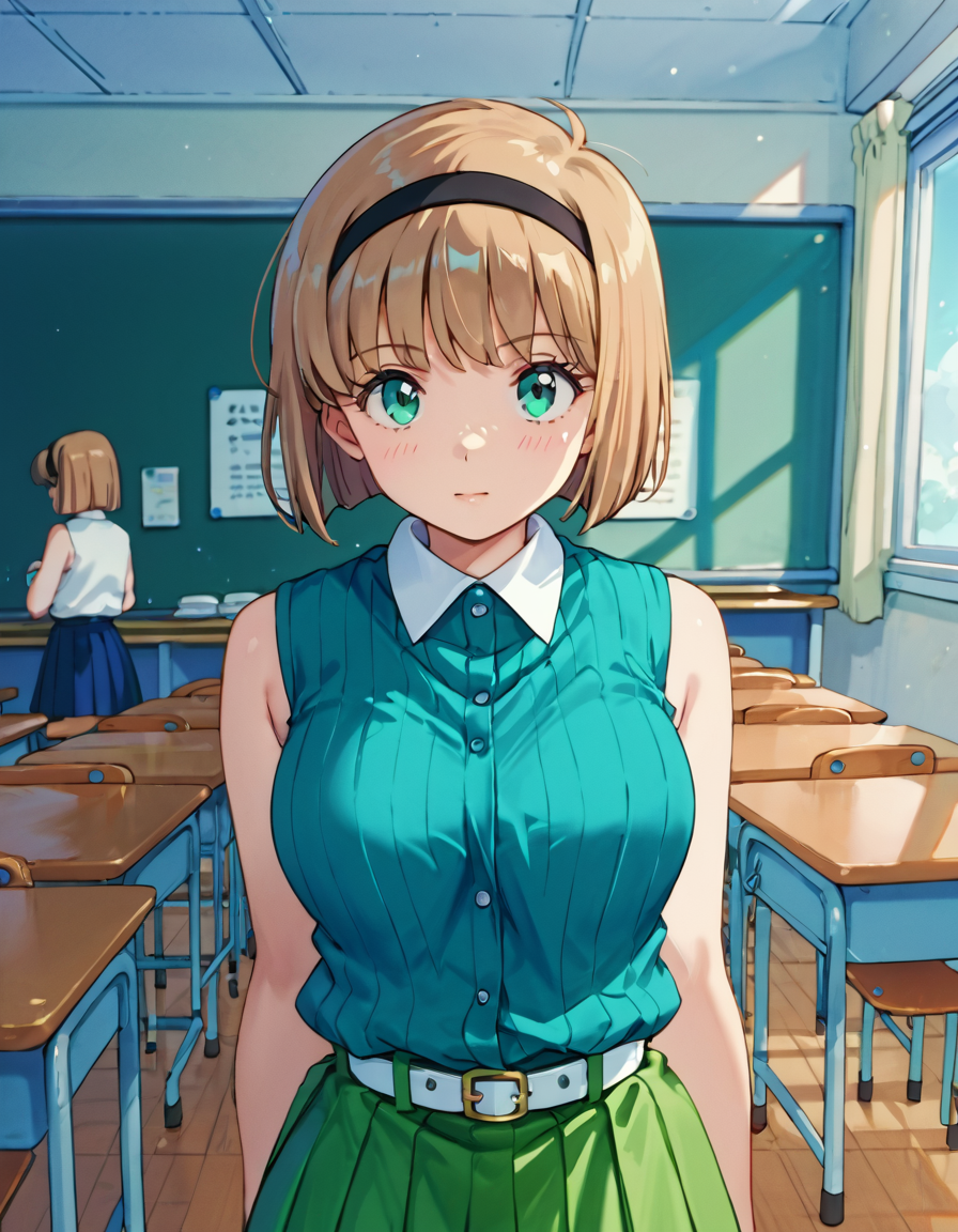 • Miki Hosokawa, Miki, brown hair, green eyes, black hairband, hairband, bob cut, short hair, classroom, sleeveless, shirt, belt, sleeveless shirt, skirt