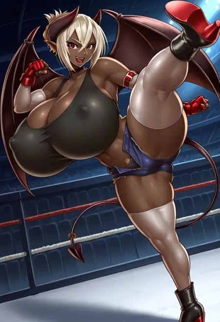 Foria,demon girl,dark-skinned female,red eyes,lipstick,demon horns,demon wings,demon tail,sport bra,shorts,red gloves,thighhighs,high heels