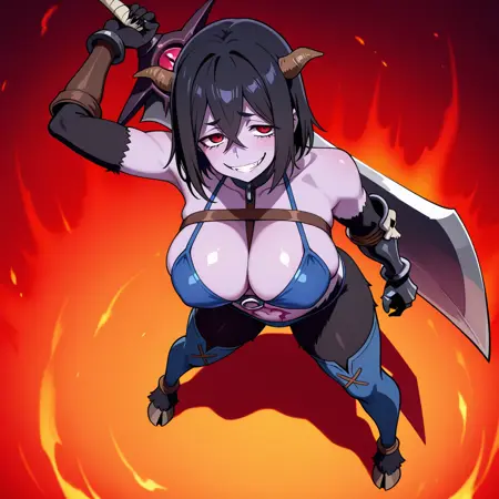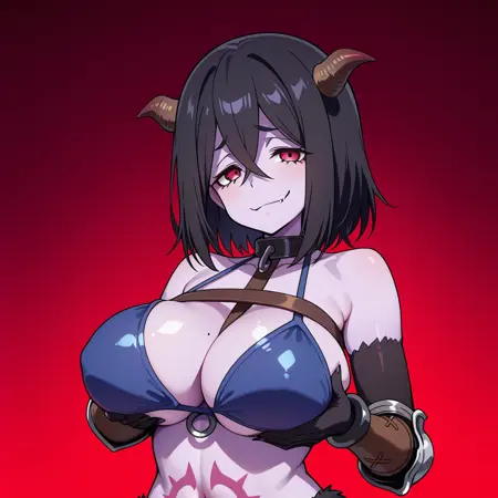 | トレーニングワード | ChaosMachina, 1girl, solo, purple skin, black hair, short hair, hair between eyes, demon girl, monster girl, demon horns, large breasts, red eyes, bikini armor, o-ring, collar, elbow gloves, gauntlets, claws, stomach tattoo, blue thighhighs, black fur, hoovesコピーしました! muscular female, forehead mark, facial markコピーしました! |