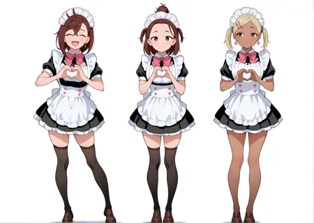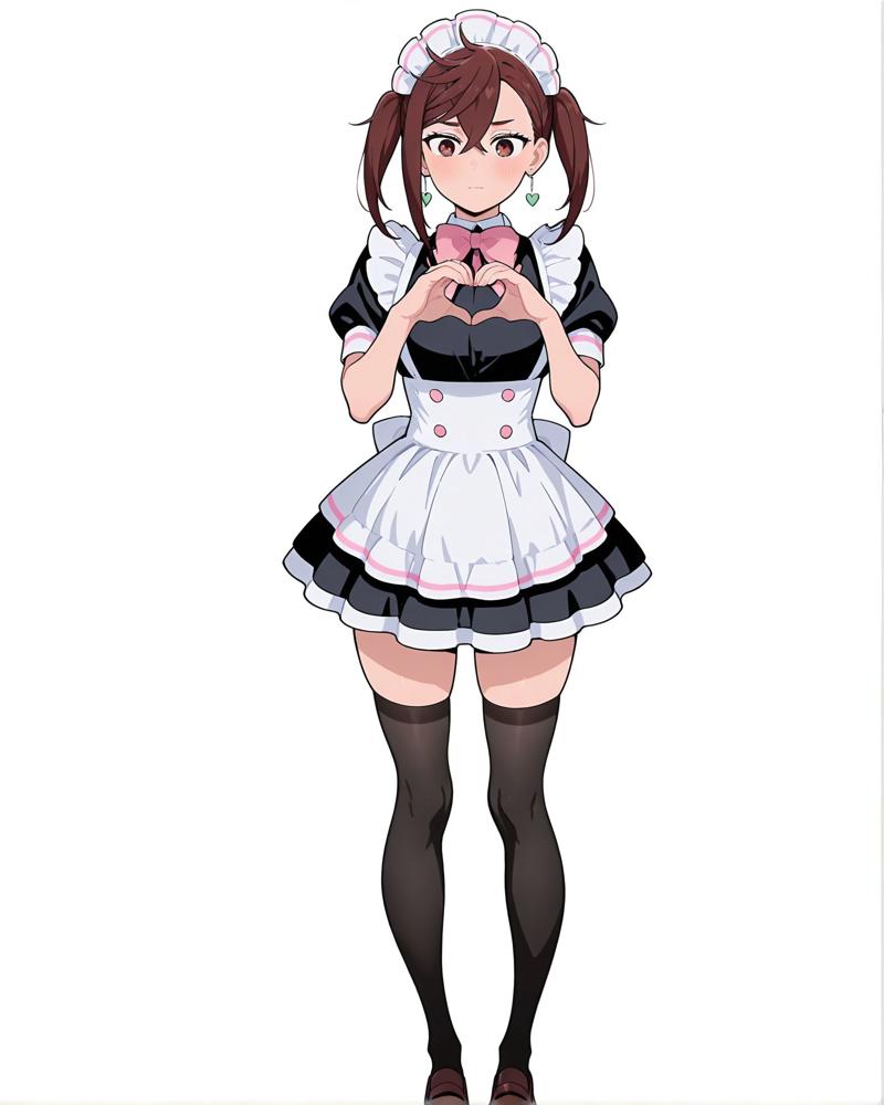 Heart hands,brown hair, skirt,blackloafers,bow, frills,
