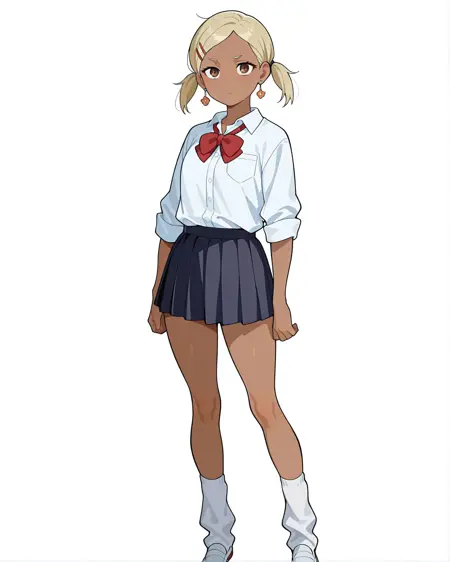 standing, full body, white shirt, red bow,