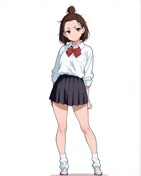 skirt, white shirt, red bow, top knot,