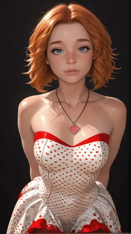 ハートのドレス、赤いハート、白と赤のドレス、ストラップレス、ハイローデザイン、模様入りスカート、非対称なスカート、赤いレースのフリンジ、ペンダントネックレス、ハート型のペンダント