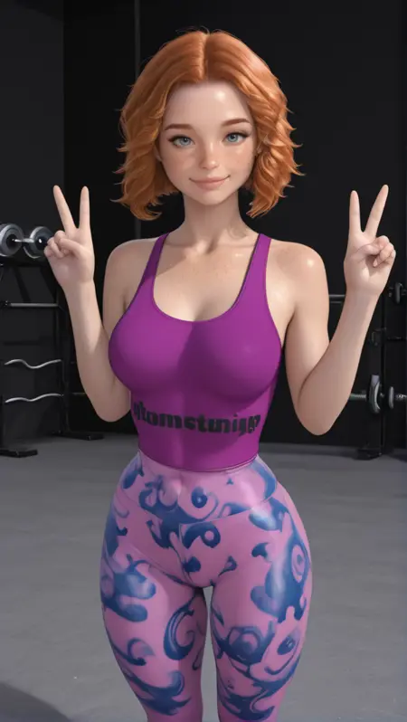 ジムウェア、パープルのタンクトップ、タンクトップの前面に黒い文字、低めの首元、ヨガパンツ、多色のヨガパンツ、模様入りヨガパンツ、ピンクのヨガパンツ、青い糸のような模様、肌にぴったりフィットするヨガパンツ
