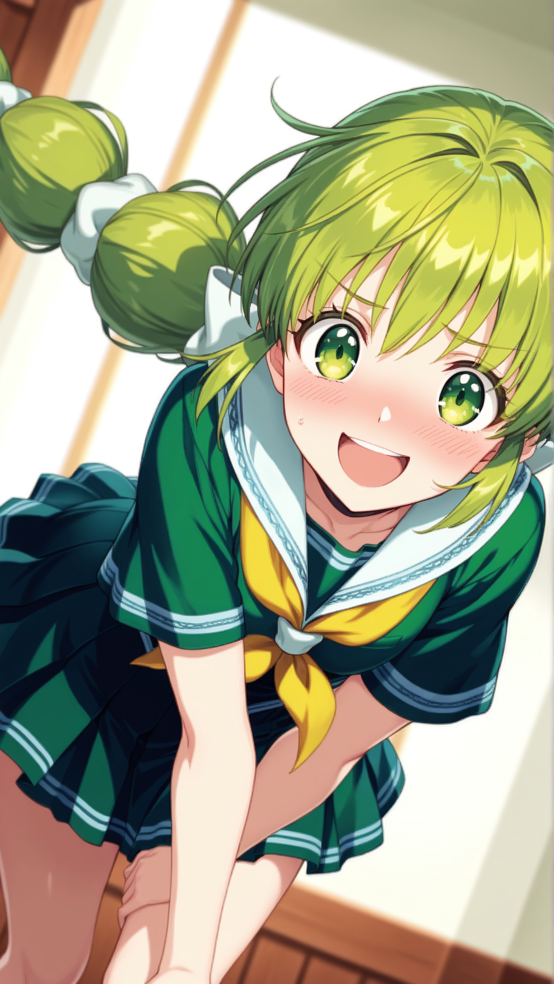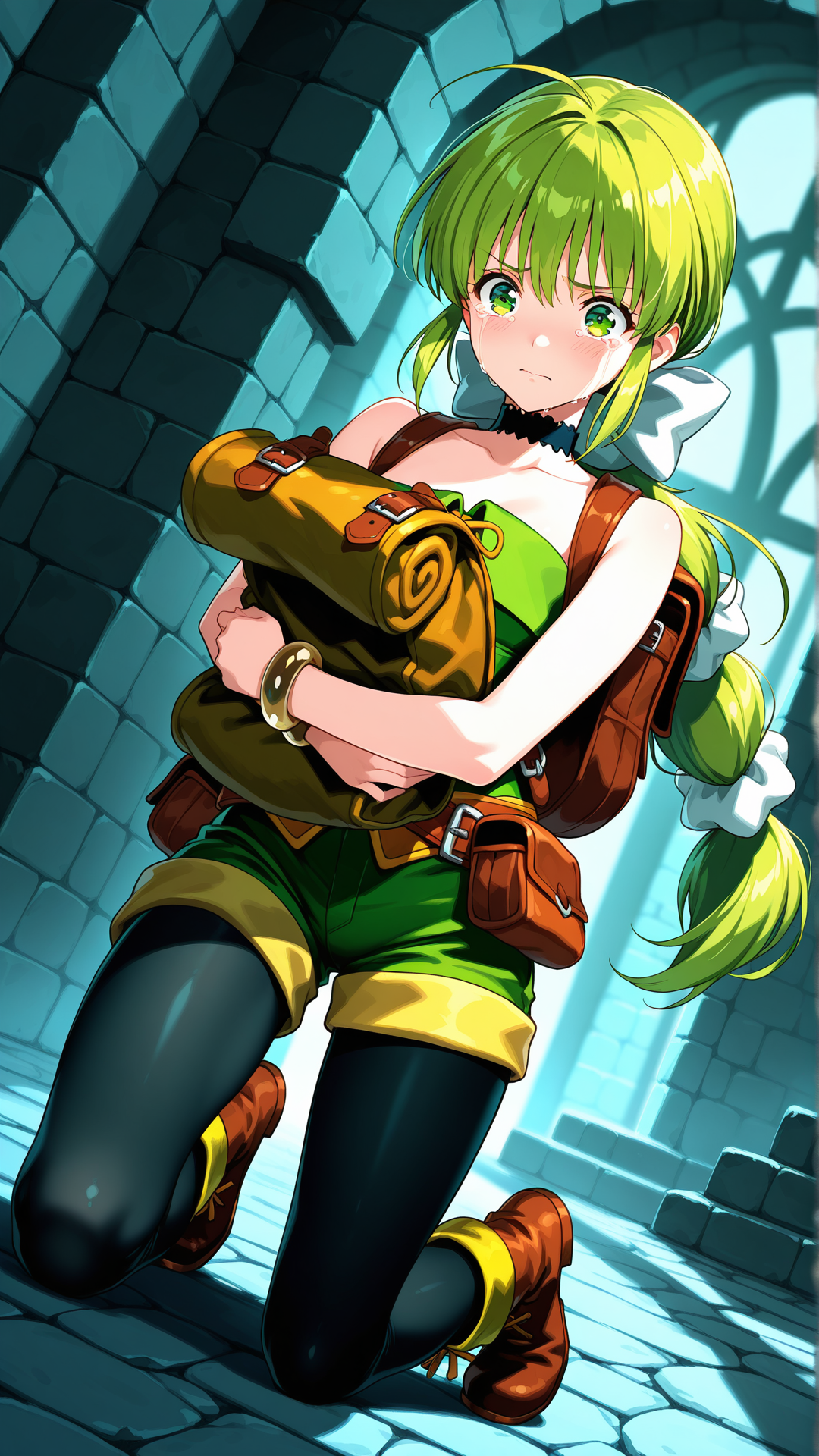 外观:非常长的头发,多股绑发,绿色头发,绿色眼睛,马尾辫,