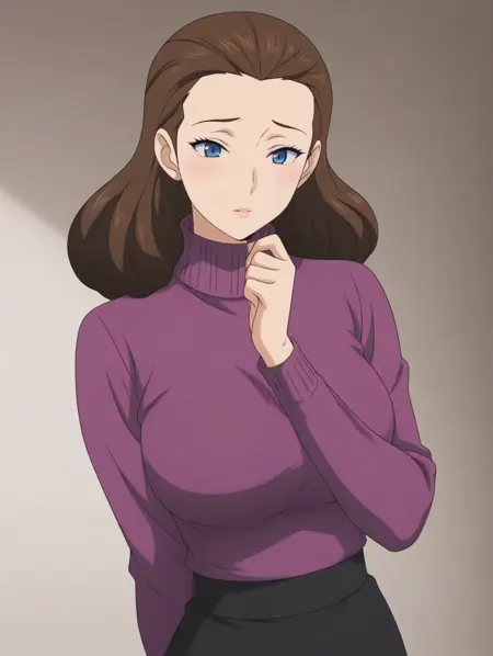 其他: brown_hair, blue eyes, purple_sweater, turtleneck, black skirt
